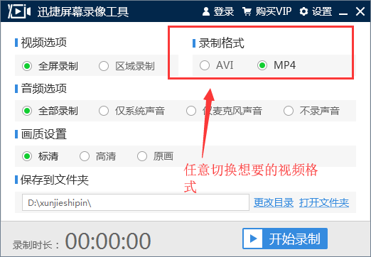 3、选择录制格式,其能够支持AVI、MP4等两种常见的视频格式,您可以根据需要选择。
