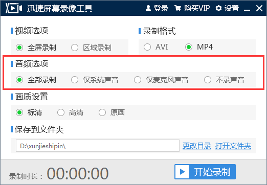 4、音频选项,用户可以对录制选择是否录制声音,其支持全部录制、仅系统声音、仅麦克风声音、不录制声音等多种预设。