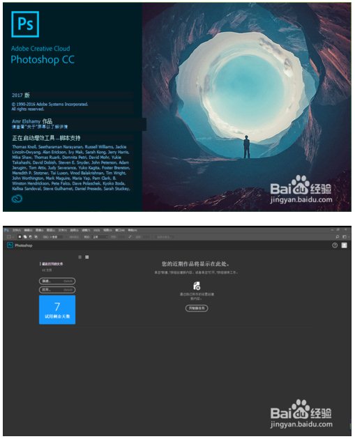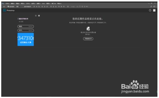 这里显示了我们打开的PS2017启动程序界面,以及启动之后软件的界面。我们看到还有7天的试用期限。然后新建一个工作界面,查看一下各项工作工具是否完善。