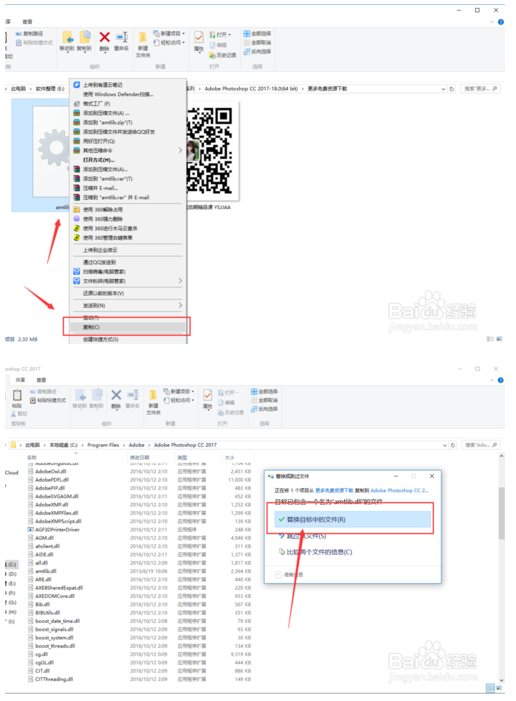 做到这里我们软件就先进行关闭,然后进行破解,打开我提供的破解补丁。复制补丁文件amtlib.dll, 这个文件是破解过的,我们直接复制到我们的PS安装根目录即可。进行替换。例如我的位置是:C:\Program Files\Adobe\Adobe Photoshop CC 2017, 找到这里之后进入黏贴。然后替换掉。然后再次打开PS之后可以看到我的试用天数是7位数。