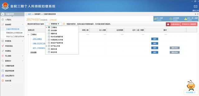 人员信息录入后,点击左侧功能菜单“报表填写”列表中的“扣缴个人所得税报告表”,出现如图所示;