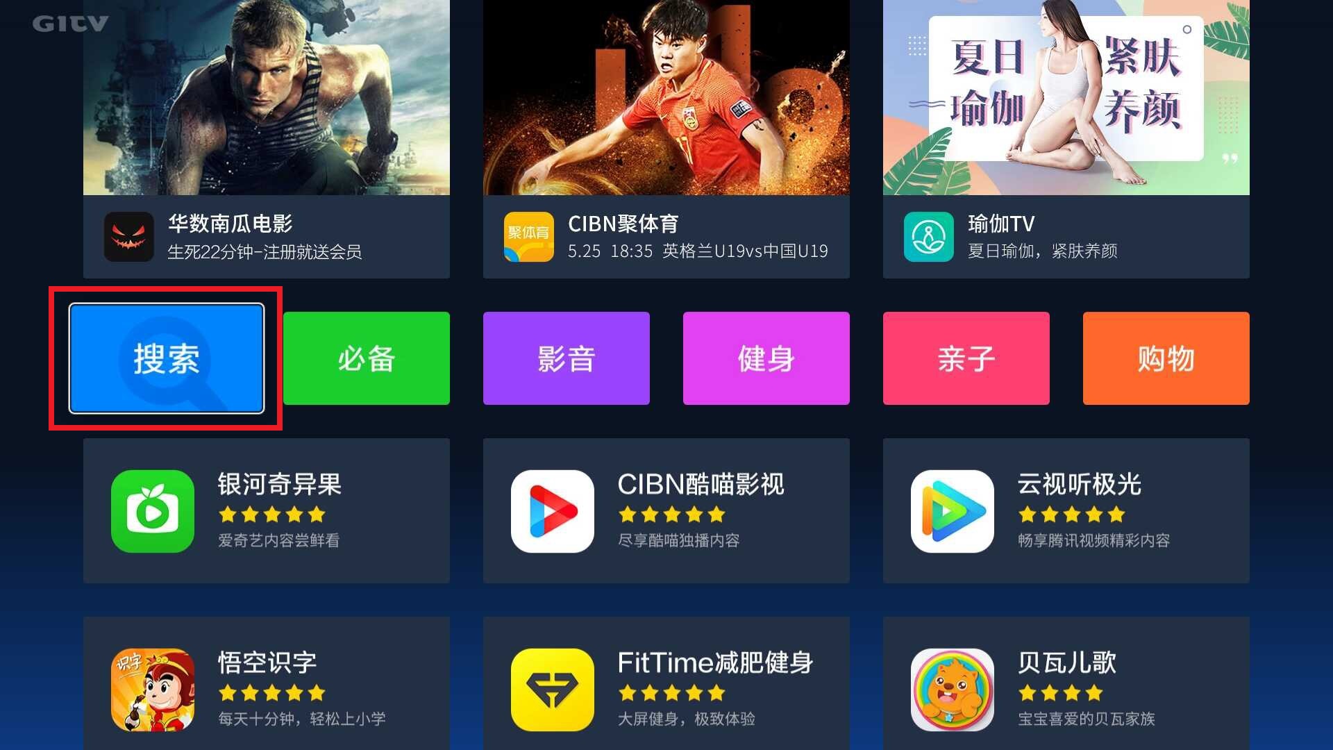 1.打开电视【应用】,进入【搜索】页面;