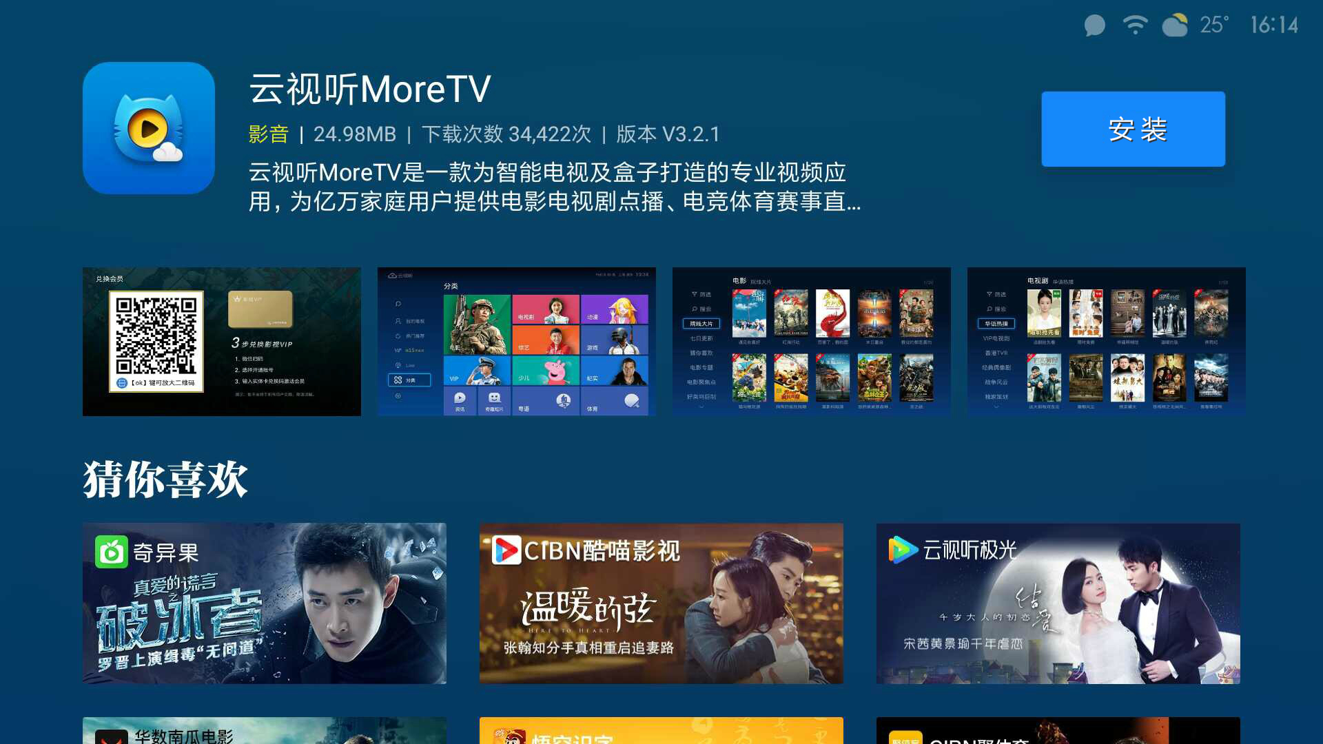 4.点击电视猫猫头图标进入详情页,点击【安装】按钮,即可安装电视猫视频(云视听MoreTV);
