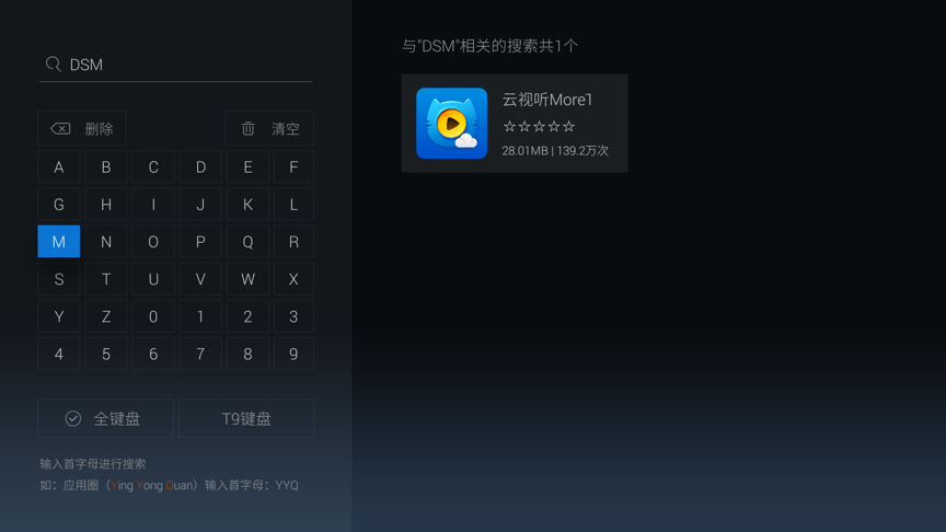 2.在搜索页面,输入“DSM”,即电视猫首字母,搜索到电视猫视频(云视听MoreTV);