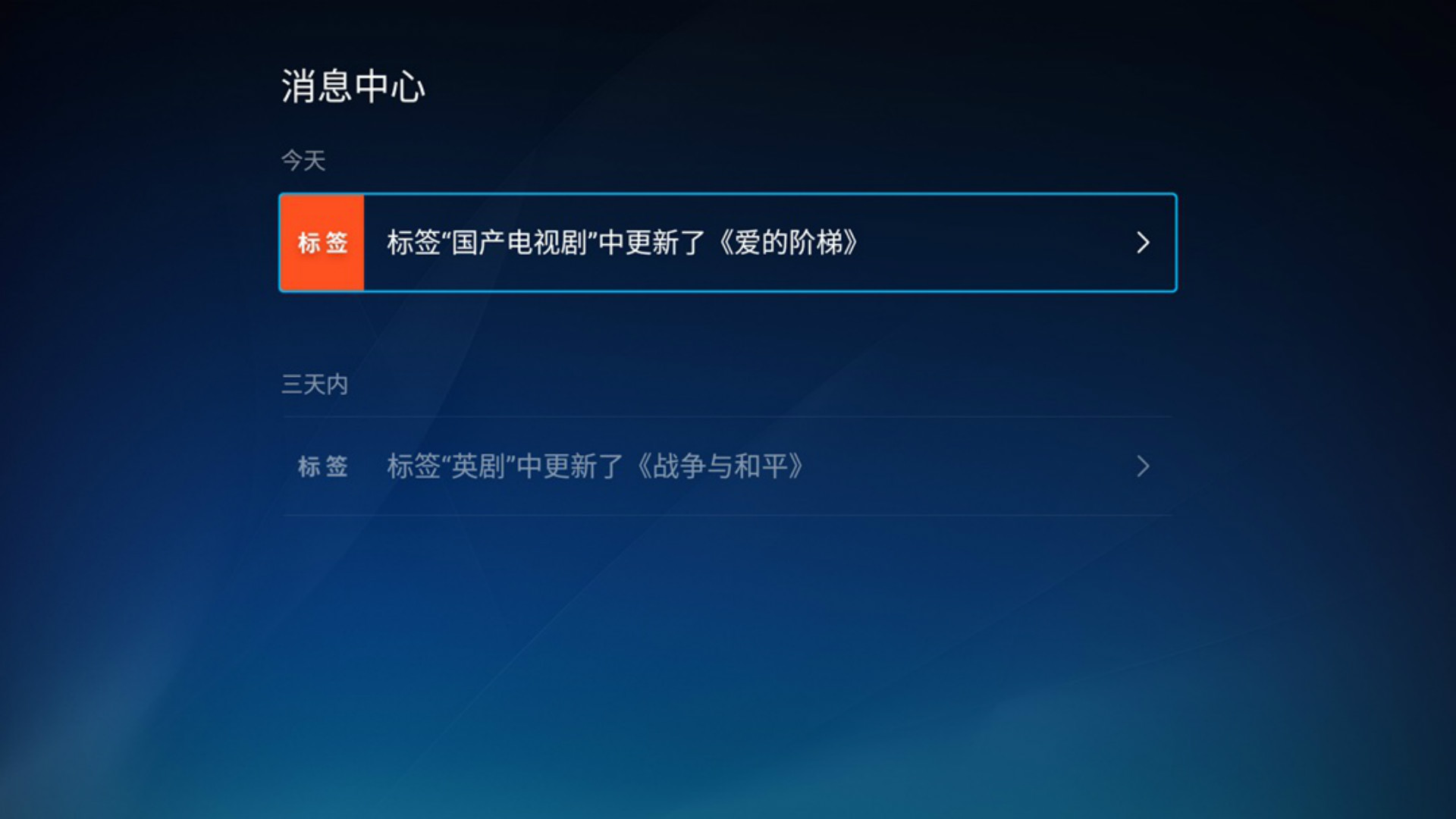 5.一旦订阅的标签下有更新,电视猫视频(云视听MoreTV)会立即通知你,让你第一时间get最新的影视剧集;在【帐户中心】中的【消息中心】可以随时查看标签更新哦。