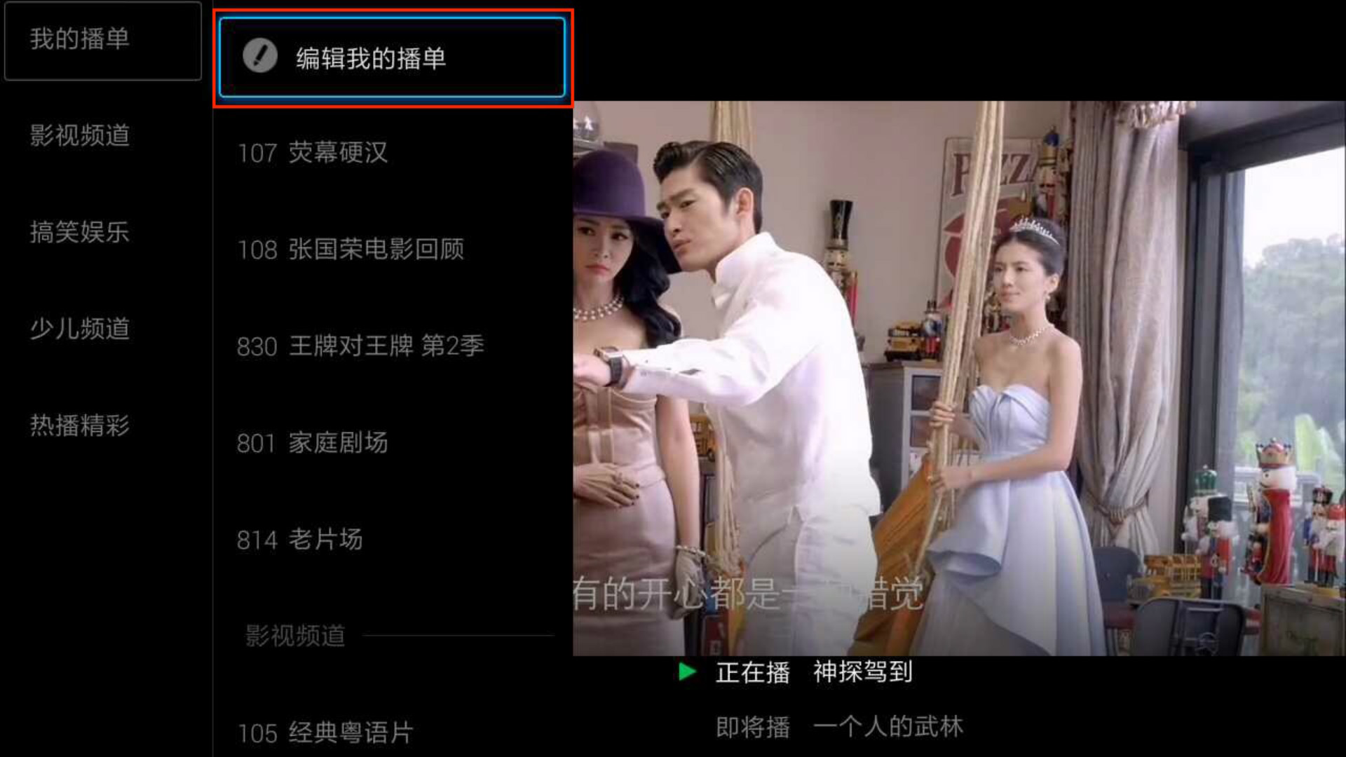1.进入Live版块,点击全部播单,按OK键调出频道列表,点击【我的播单】下方的【编辑我的播单】;