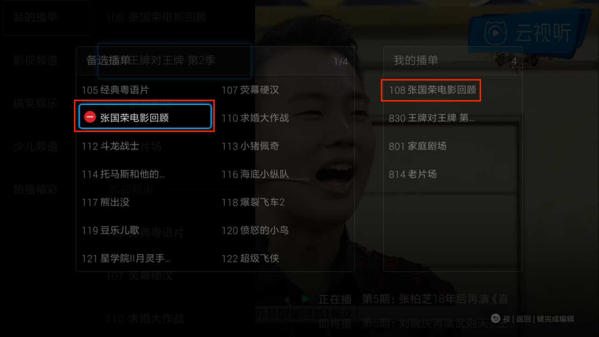 2.在备选播单页面中,点击中意的播单进行添加,已选中的播单就会出现在屏幕右侧【我的播单】中,小编喜欢看张国荣的电影,这里就以“张国荣电影回顾”播单为例;