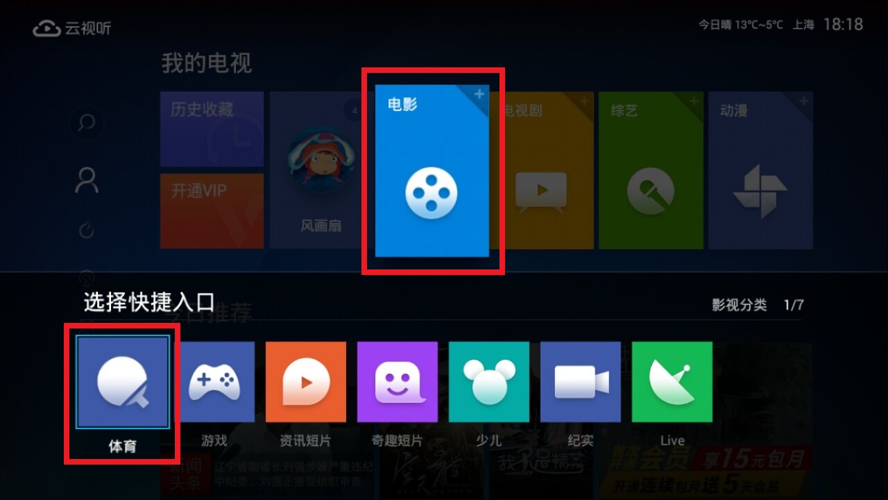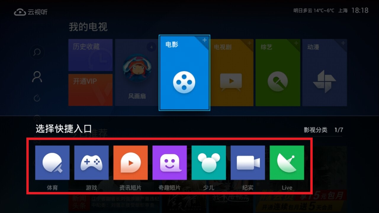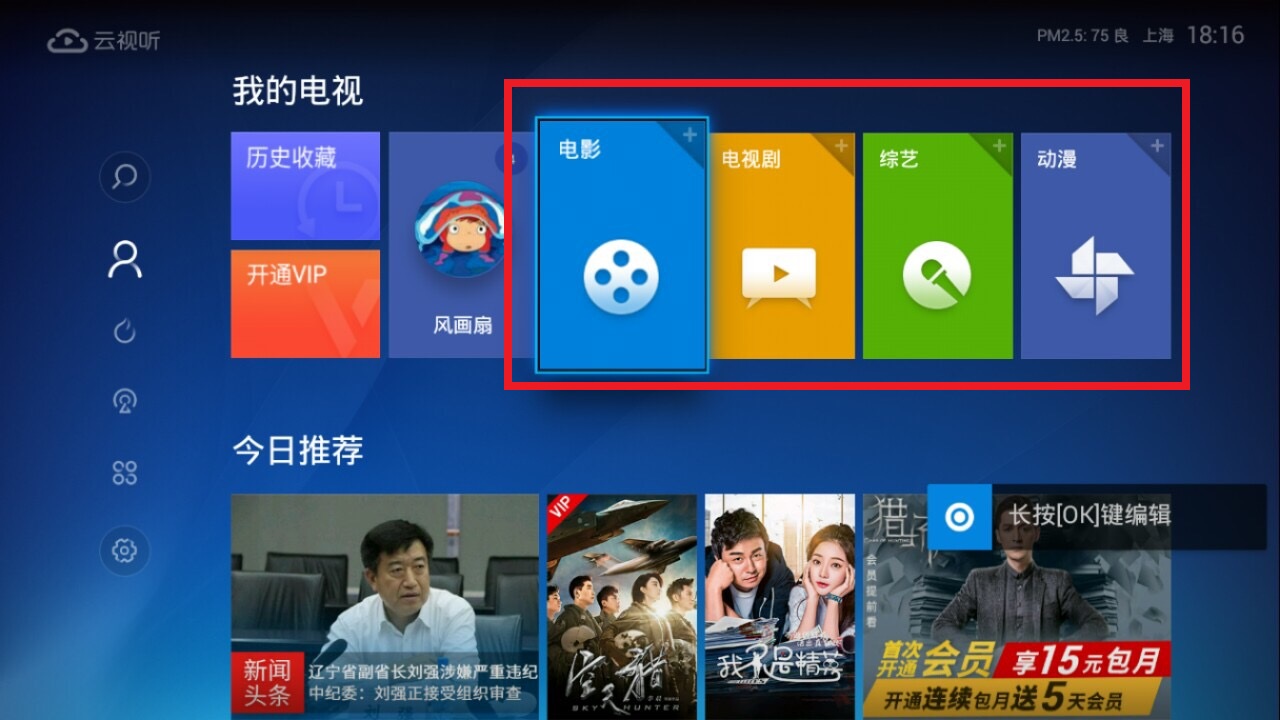 1.进入首页,将光标移动到某个模块(首页四个模块都能自由替换,这里以电影为例);