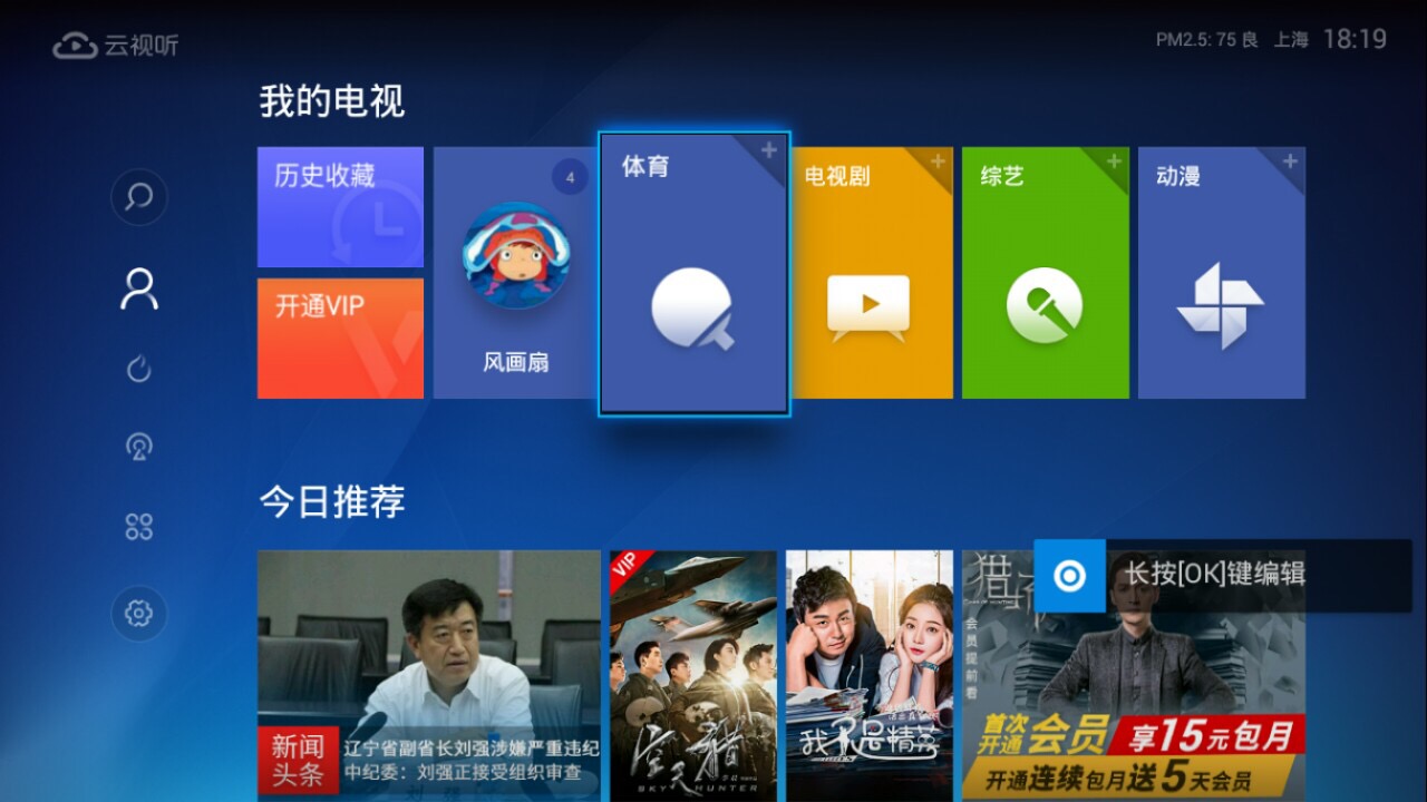 2.长按OK键,出现替换模块,共有9个内容板块随心切换(电视剧、电影、体育、Live、综艺、资讯短片、纪实、动漫、少儿);