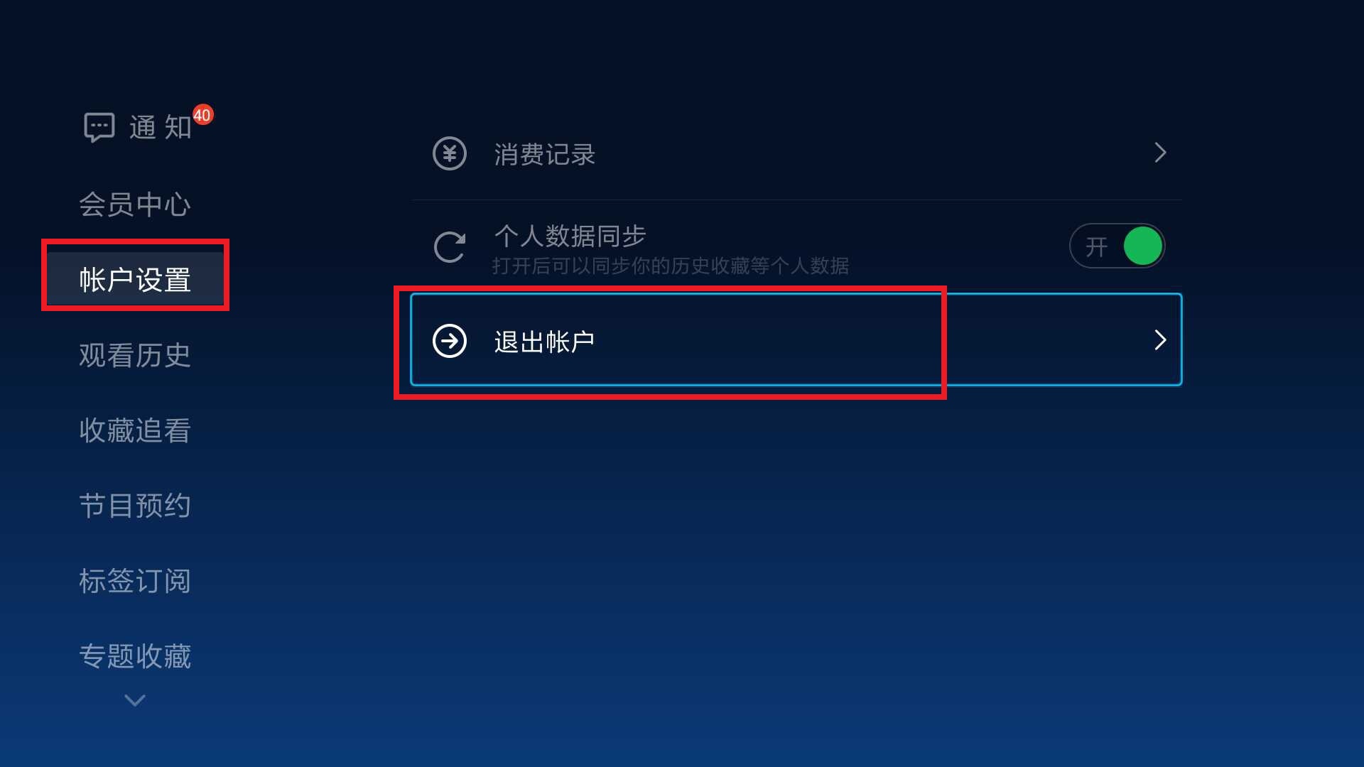 2.移动光标至【帐户设置】,点击【退出帐户】;