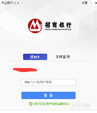 电脑上插入U盾,然后点击桌面上的招商银行的软件图标,进入到登录界面