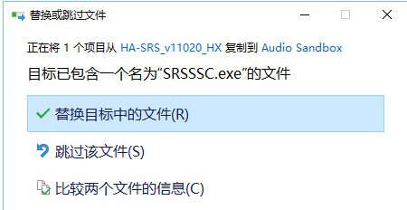 2、将HA-SRS_v11020_HX文件夹下的“SRSSSC.exe”文件复制到软件的根目录下,选择替换操作,如下图所示: