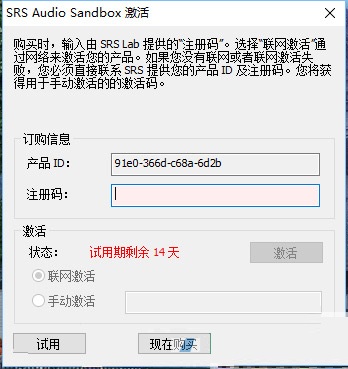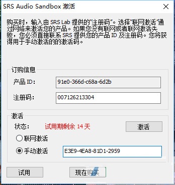 5、将注册码以及手动激活代码复制到SRS Audio Sandbox的注册界面内,如下图所示,选择手动激活: