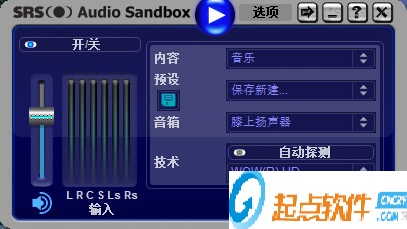 SRS Audio Sandbox的特点是可以用2.1音箱来营造出一个逼真的全360度环绕立体声场,而且这系统适用于所有双声道的音源,包括所有立体声及简单环绕声,或包含有其它系统编码的音源。更重要的是,对于只拥有单声道音源的老款笔记本等,SRS Audio Sandbox也有一个名为3D Mono的模拟立体回放技术。目前,SRS Labs的SRS及3D Mono技术已被多个国家的主要影音器材生产厂家广泛接受,并被普遍的应用在专业音响、家庭影音、及汽车音响器材上。迄今,全球应用了SRS Labs技术的产品总数已超过三千万台。 SRS Audio Sandbox比我们熟悉的DFX音效插件强的多了,就算你只拥有一只普通的“滥耳机”也可以“变”成拥有5.1音场的高级装备,尝试一下SRS Audio Sandbox,感受真正通透清晰的立体声场吧!