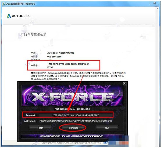 将“申请码”复制到注册机的第一项中,点击“Generate”,生成激活码;