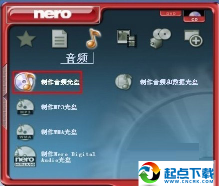 2、由于有些人刻录的东西都不一样,在这里我就不一一详解了,就用制作MP3光盘来当作例子,其实操作很简单,所以我想基本上每个人都看得懂。鼠标移动第三个【音 频】那里,然后再点下面红框的制作音频光盘。