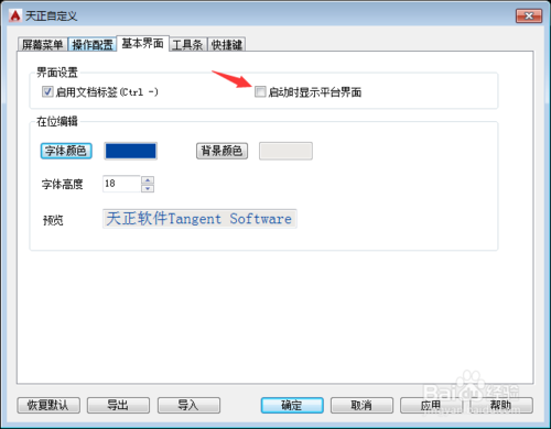 在天正设置,自定义,基本界面,启动时显示平台界面