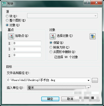 3、选择对象后,修改块名称和保存路径,这里我将块命名为“手术台”,路径设为桌面,插入单位一般改为毫米,可根据自己的喜好设置。确定后,手术台图块就以dwg格式保存到了桌面。