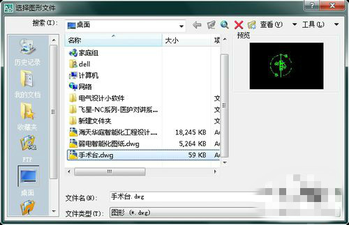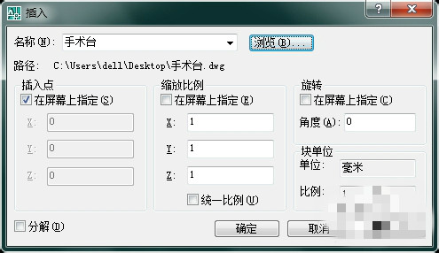 4、新建一个CAD样板,在新建CAD中调用手术台图块,插入——块——浏览,选择桌面的手术台dwg文件,确定后插入图块成功。