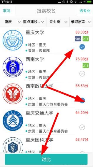 2、在这里选择你要对比的院校,勾选即可,然后点击箭头所指的对比位置!