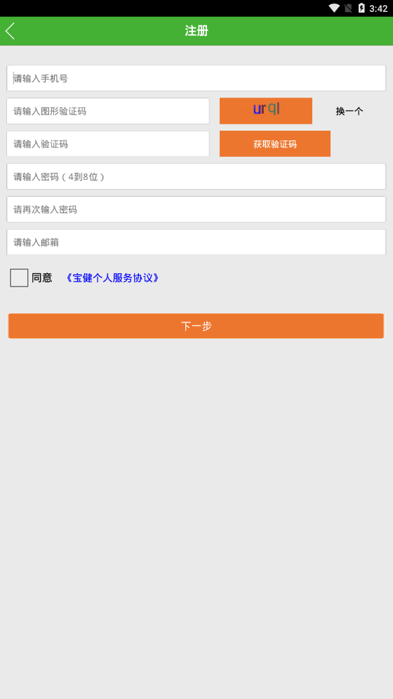 3、用户需要输入手机号、图形验证码、手机验证码、密码和邮箱账号之后,点击“下一步”,完成注册。