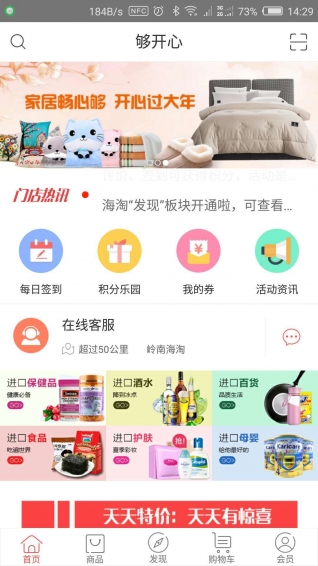 够开心新零售体验店,位于广州番禺厦滘岭南海淘新零售商城。拥有母婴玩具、精品家居、零食饮品、服饰箱包、美妆个护等全品类商品,依托阿里巴巴大数据系统,通过VR、试衣间等技术给消费者带来全新的购物体验,同时,打通线上线下,实现线上线下的同款同价。【更新日志】