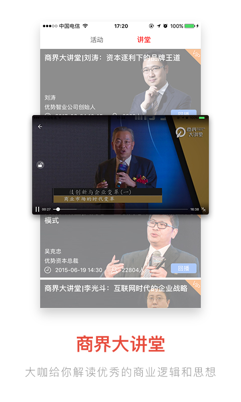 在资讯方面,“商界”App整合了商界领袖俱乐部会员服务,形成了集《商界》杂志、大咖微讲堂、《商界问商界:商界明星访谈录》、《商界领袖每周内参》为一体的,文字、视频、音频立体化的资讯矩阵。