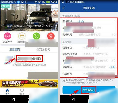【违章查询】:交管局违章记录实时查询,支持全国30省300城市【违章详情】:违章路段、时间、类别,对应的罚款、扣分、处理地址等信息