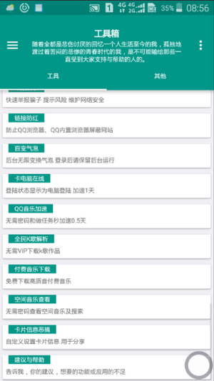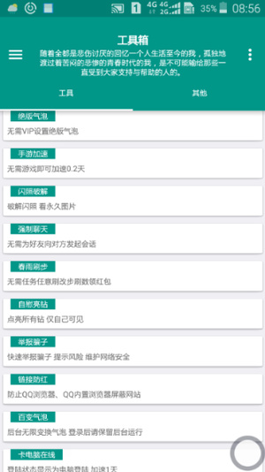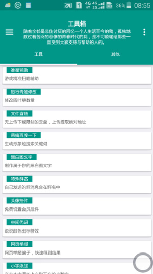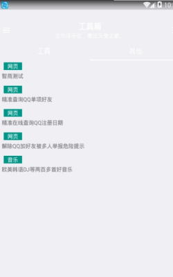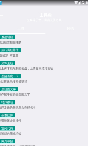打开DD工具箱app软件,在工具箱一栏有很多功能,准星辅助、旅行青蛙修改、文件直链等点击其他,还会有智商测试、精准查询qq单项好友