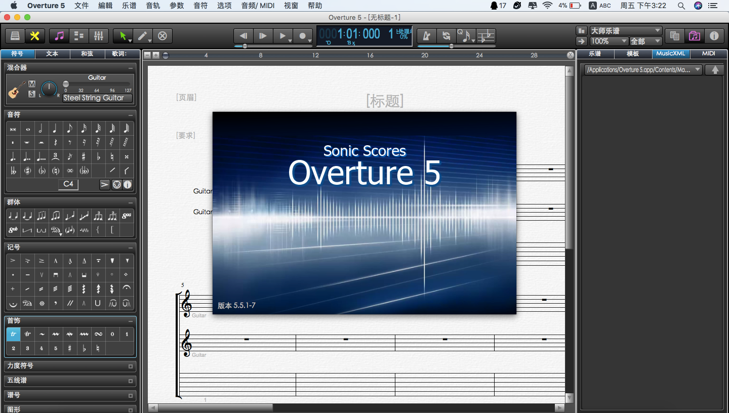 Overture for Mac是由Geniesoft公司出品的一款专业钢琴打谱软件,Overture Mac版集五线谱打谱、写谱歌词、编辑、制作、印谱等功能与一身,而且支持边听边修改,绝对是打谱的首选软件。