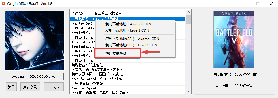 可选(2) #3:右击列表任意位置,点击”快速安装游戏”