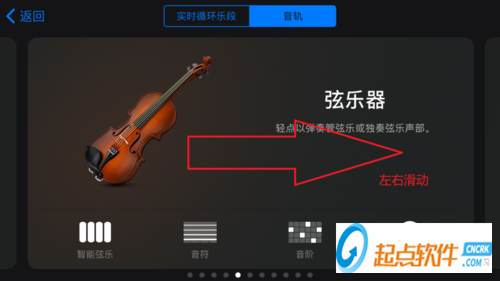 1、首先我们打开我们的库乐队应用,进入到主界面可以看到当前使用的乐器,左右滑动可以改变我们的乐器。