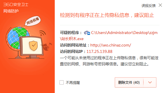 如果有朋友遇到了360报上传隐私的问题,请点击允许,因为站长积木必须访问网站才能获得信息,例如chinaz、爱站、Sogou的网站例如下面就是要站长积木要访问seo.chinaz.com域名时,360会给出提示,在右下角选择允许,并且勾选左边的不再提醒就OK了