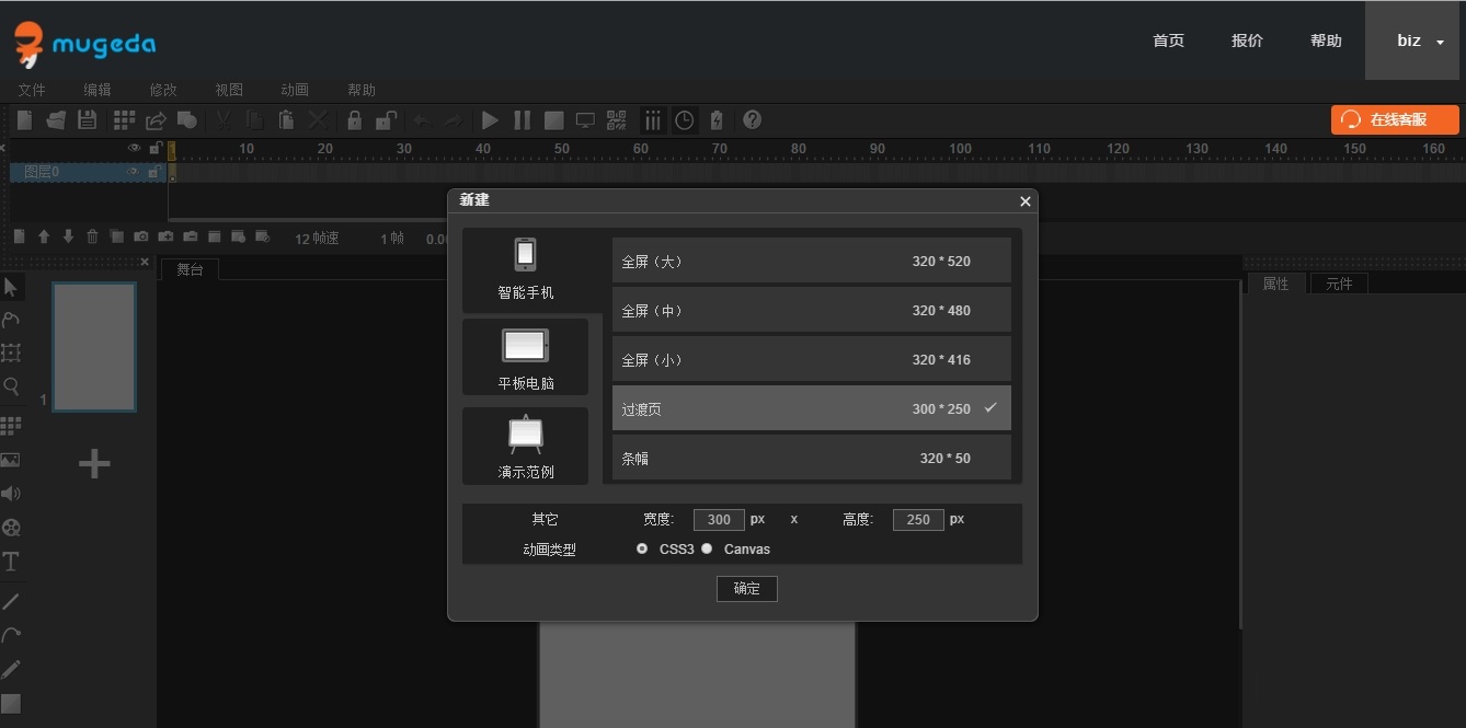 进入MugedaStudio后,首先需要选择一个动画尺寸,可以选择预设的尺寸,也可以手动输入自定义尺寸。
