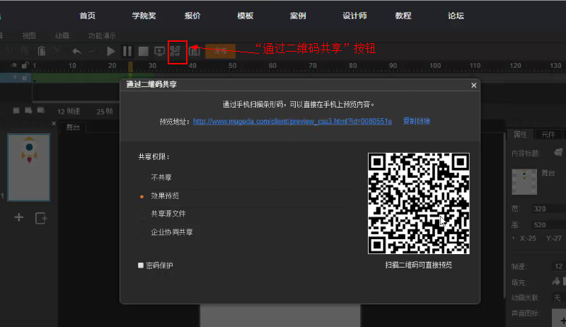 手机观看:点击“通过二维码共享”按钮,可用手机扫描出现的二维码观看作品效果。