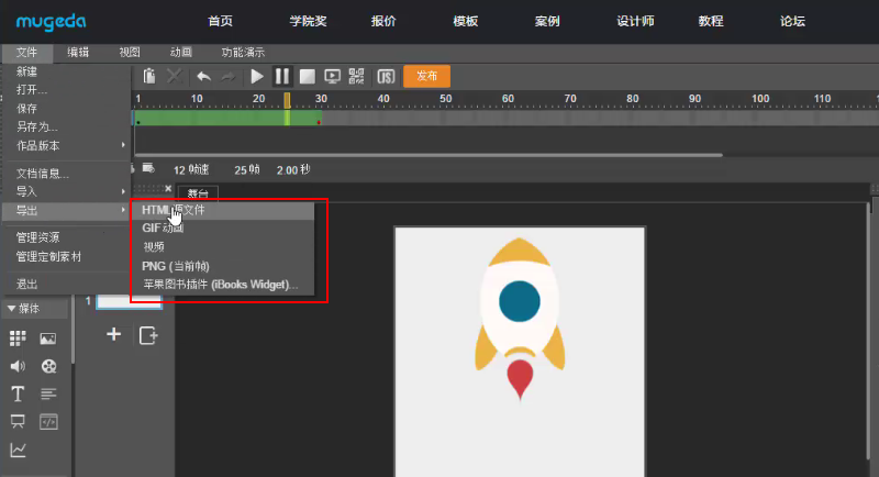 Mugeda支持HTML5源文件、GIF、视频、PNG等格式的导出,导出步骤:“文件”→“导出”→选择导出格式