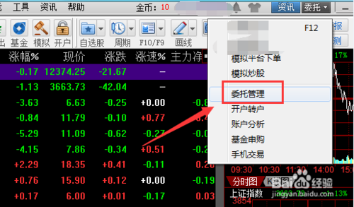 添加券商首先我们下载安装好软件,然后用手机注册,打开客户端。点击右上角的【委托】的下拉菜单。