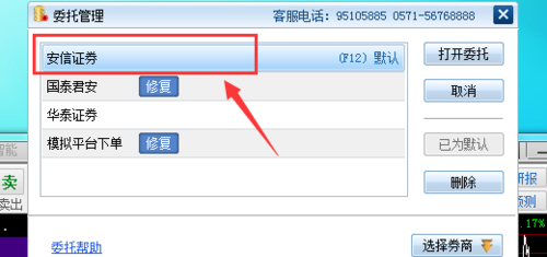 这时候你就可以看到委托管理下面就开始添加券商,添加成功后会自动选择成为默认券商,下次一点击委托就自动打开i这个券商。我们先双击它。