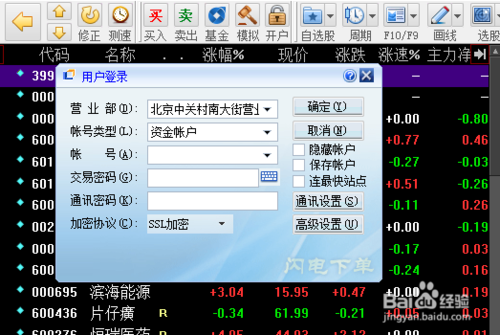 然后就根据你开户时来选择营业部、账号类型、帐号、交易密码、通讯密码,同时你可以在右侧选择保存账户,这样你就不用每次打开都要输入帐号,下次打开直接输入密码即可。