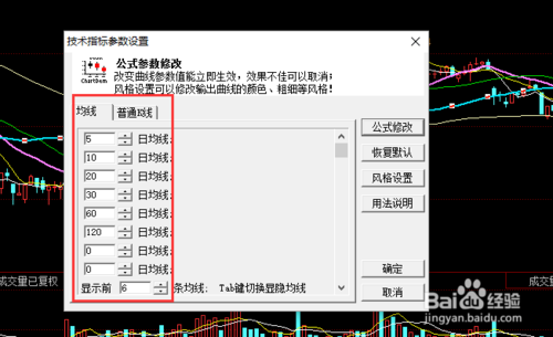 在弹出的“技术指标参数设置”对话框中,修改自己想要设置的均线参数,本例中,我设置的是5,10,20,30,60,120日均线。点击“确定”即可。如果想设置更多的均线,可以显示7、8、9...条均线,或者更少的均线。