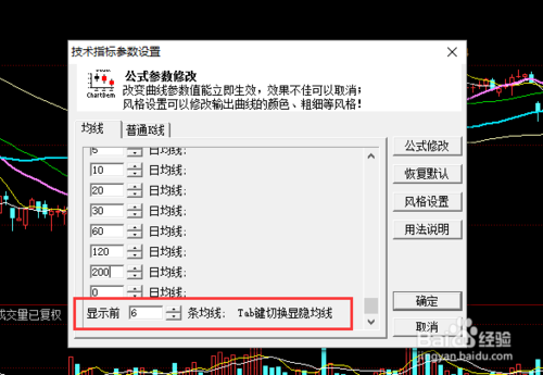 红色框中,可以设置显示均线的条数。同时提示”Tab“键可以切换显示或者隐藏均线。有的股民在使用过程中,有时候不小心删除了均线,不知怎么调出来,这里提示,按”Tab“键即可。
