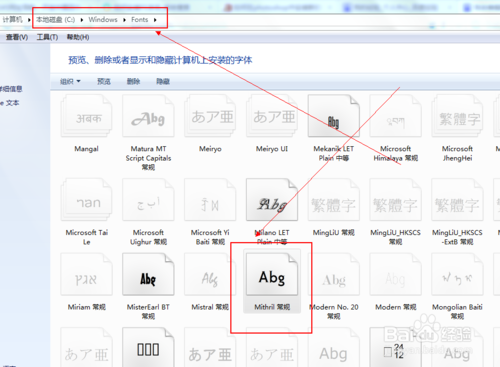 第五步:在FONTS文件夹中粘贴完我们的字体之后,为了确保我们的字体是否已成功复制粘贴在FONTS文件夹里,我们可以在FONTS文件夹内行我们的字体查找。