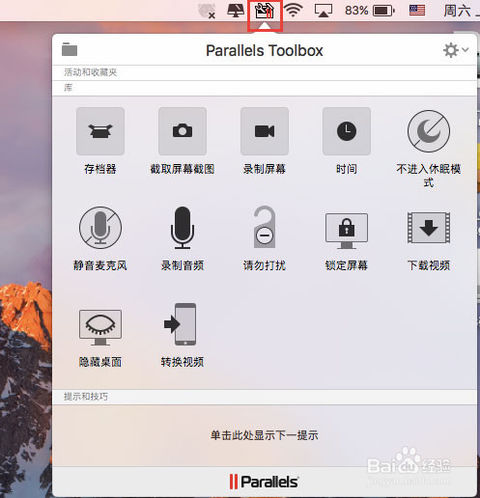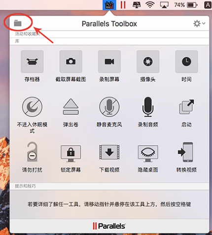 首先在Mac中打开Parallels Toolbox实用工具。默认情况下,这款工具箱安装之后Mac上方菜单中会直接出现快捷图标,只要直接点击即可打开