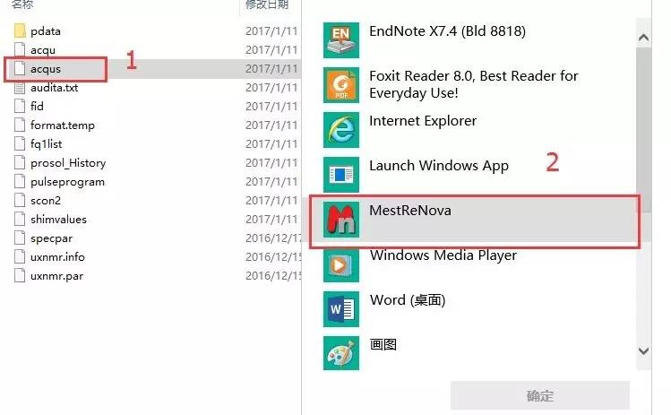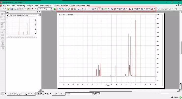 要分析核磁图,首先要先会打开它(以小编做的一个材料为例,溶剂为CDCl3)。打开文件夹,选择任意一个文件(以acqus为例)后选择用MestReNova打开。我们最常用的就是下图中红色框内的几个按钮了。