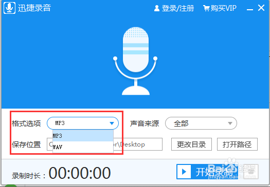 录制开始之前我们可以选择一些音频的格式,这款软件为我们提供了两种不同的音频格式,分别是MP3、WAV格式!