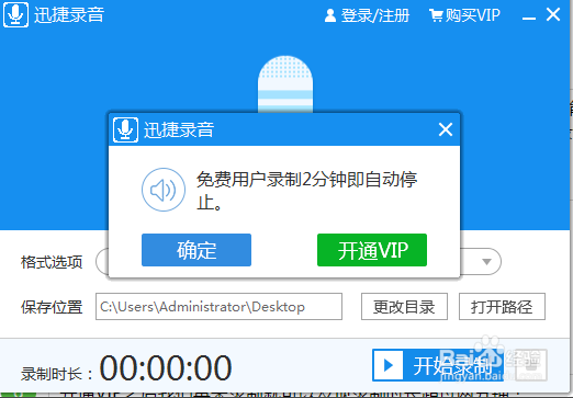接下来我们点击“开始录制”按钮后会看到系统提示“免费用户只能录制两分钟”,这个时候我们登录这软软件并开通VIP权限(VIP可无限制录制文件)!