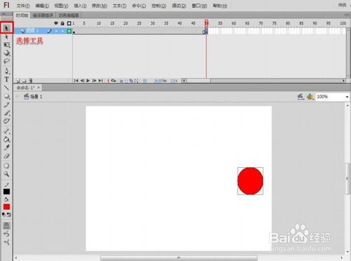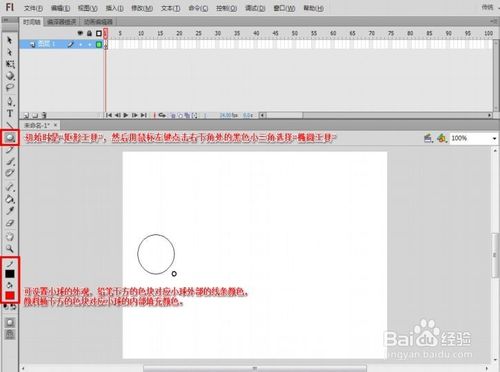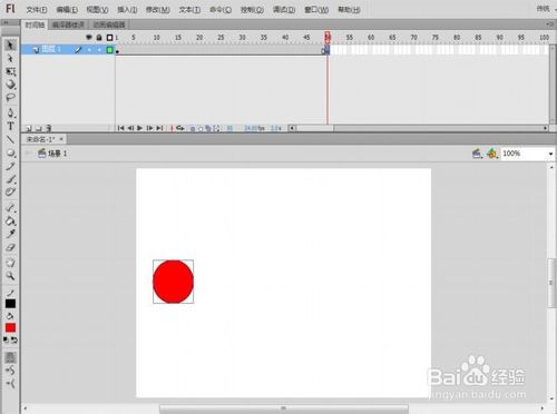 在右侧的工具箱中选择“椭圆工具”,按住键盘上的shift键,在舞台的左侧拖出一个小球