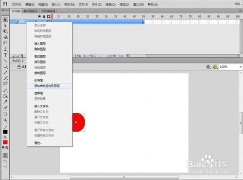 此时,按一下键盘上的Enter键可以观看到小球移动的动画效果。如果觉得不够生动,我们还可以通过添加引导层来设置小球的运动轨迹。方法是这样的,先选中时间轴上绘制有小球的图层,单击右键选择【添加传统运动引导层】