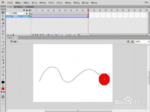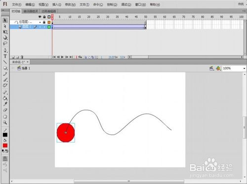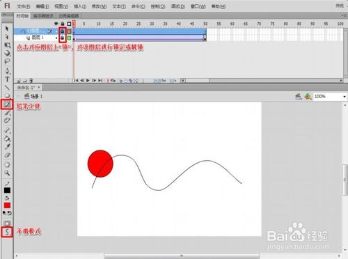 选择引导层上的第1帧(此时我们可将小球所在的图层进行锁定),选择工具箱中的“铅笔工具”,铅笔模式选择“平滑”,然后在舞台上绘制出一条曲线(小球的运动路径),锁定引导层