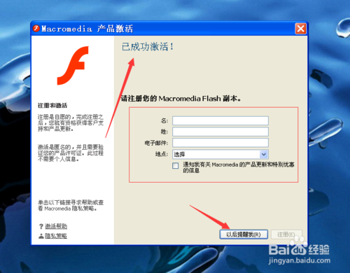15、如果序列号有效的话,页面上就会出现”已成功激活“,此时页面上还可以进行注册Macromedia Flash副本,如果不想注册,那么就选择”以后提醒我“。